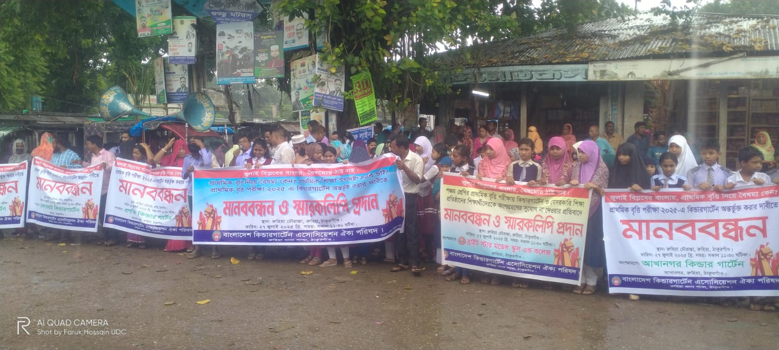 দেশের জনগণ আপনার প্রতি আস্থাশীল। সরকারি প্রাথমিক বৃত্তি পরীক্ষায় অংশগ্রহণের জন্য কিন্ডারগার্টেন ও বেসরকারি শিক্ষা প্রতিষ্ঠানের শিক্ষার্থী, শিক্ষক ও অভিভাবকসহ বিশাল জনগোষ্ঠীকে যাতে আন্দোলনে নামতে না হয় সেই বিষয়ে আপনার সুদৃষ্টি কামনা করছি এবং ১৭ জুলাই ২০২৫ তারিখে প্রাথমিক শিক্ষা অধিদপ্তর কর্তৃক অবহিতকরণ পত্রটি বাতিল করে দেশের সকল শিক্ষা প্রতিষ্ঠানের কোমলমতি শিক্ষার্থীরা যাতে পঞ্চম শ্রেণির সরকারি প্রাথমিক বৃত্তি পরীক্ষা-২০২৫ এ অংশগ্রহণ করতে পারে, তার ব্যবস্থা গ্রহণের জোর দাবি জানাচ্ছি। মানববন্ধন শেষে জেলা প্রশাসক ঠাকুরগাঁও বরাবর একটি স্মারক লিপি প্রদান করা হয়।