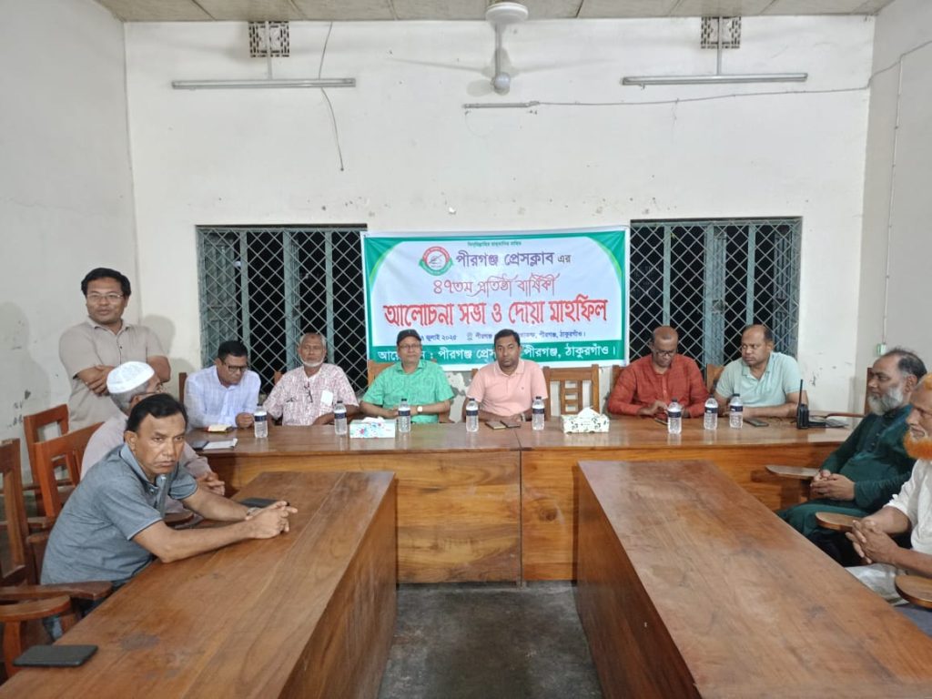 পীরগঞ্জ(ঠাকুরগাঁও)প্রতিনিধি: ঠাকুরগাঁওয়ের পীরগঞ্জ প্রেসক্লাবের ৪৭ তম প্রতিষ্ঠা বার্ষিকী উপলক্ষে আলোচনা সভা ও দোয়া মাহফিল হয়েছে। রবিবার দিবাগত রাতে প্রেসক্লাবের সভা কক্ষে এ সভা ও দোয়া মাহফিল হয়।