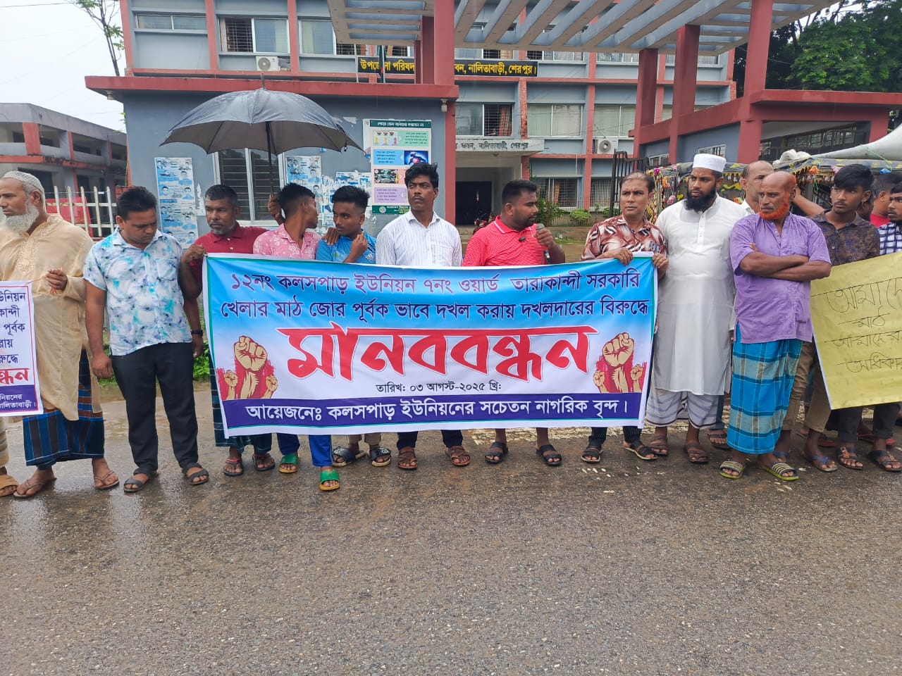 নালিতাবাড়ীতে খেলার মাঠ দখল করে হালচাষ ও কাঁটাতারের বেড়া নির্মাণের প্রতিবাদে মানববন্ধন