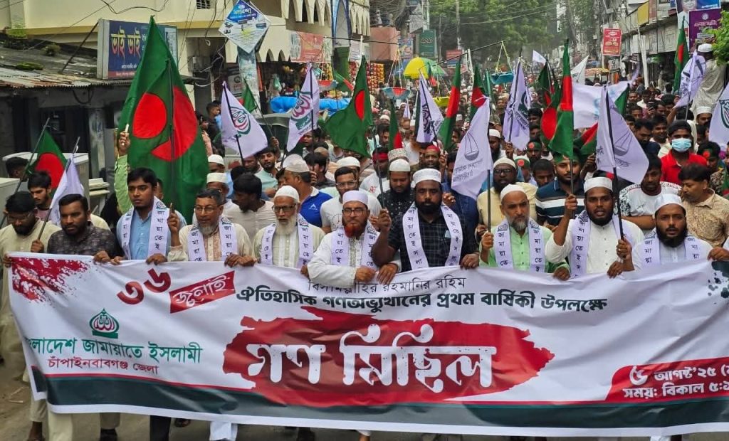৩৬ জুলাই ঐতিহাসিক গণ-অভ্যুত্থানের প্রথম বর্ষপূর্তি উপলক্ষে বাংলাদেশ ইসলামী ছাত্রশিবির চাঁপাইনবাবগঞ্জ জেলা শাখার উদ্যোগে এক বর্ণাঢ্য বিজয় র্যারি অনুষ্ঠিত হয়েছে।