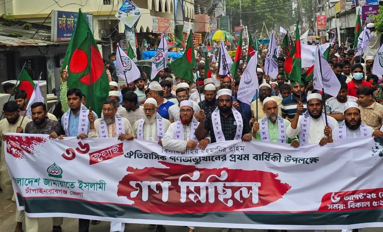 ৩৬ জুলাই ঐতিহাসিক গণ-অভ্যুত্থানের প্রথম বর্ষপূর্তি উপলক্ষে বাংলাদেশ ইসলামী ছাত্রশিবির চাঁপাইনবাবগঞ্জ জেলা শাখার উদ্যোগে এক বর্ণাঢ্য বিজয় র্যারি অনুষ্ঠিত হয়েছে।