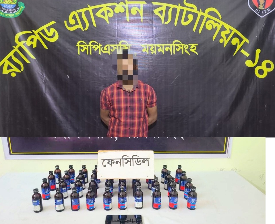 এস.এম.জামাল উদ্দিন শামীমঃ ময়মনসিংহে ৪০ বোতল অবৈধ ফেনসিডিলসহ ০১ মাদক কারবারিকে গ্রেফতার করেছে সিপিএসসি, র্যাব-১৪।
