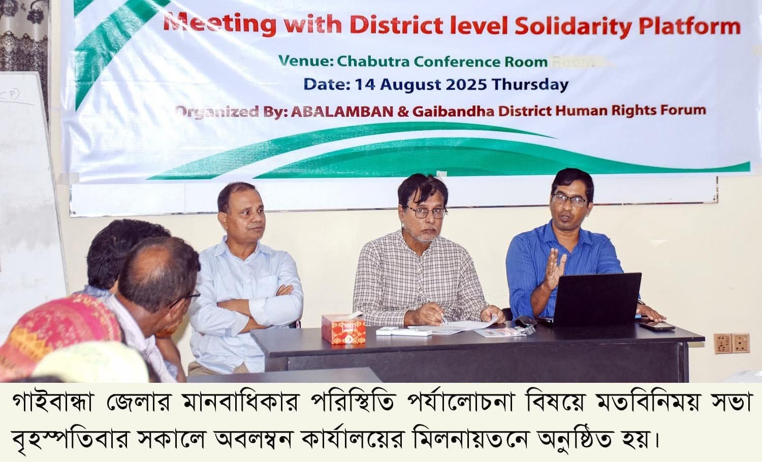 গাইবান্ধা থেকে মোঃ আবু জাফর মন্ডলঃ গাইবান্ধা জেলার মানবাধিকার পরিস্থিতি পর্যালোচনা বিষয়ে এক মতবিনিময় সভা বৃহস্পতিবার সকালে অবলম্বন কার্যালয়ের মিলনায়তনে অনুষ্ঠিত হয়েছে।