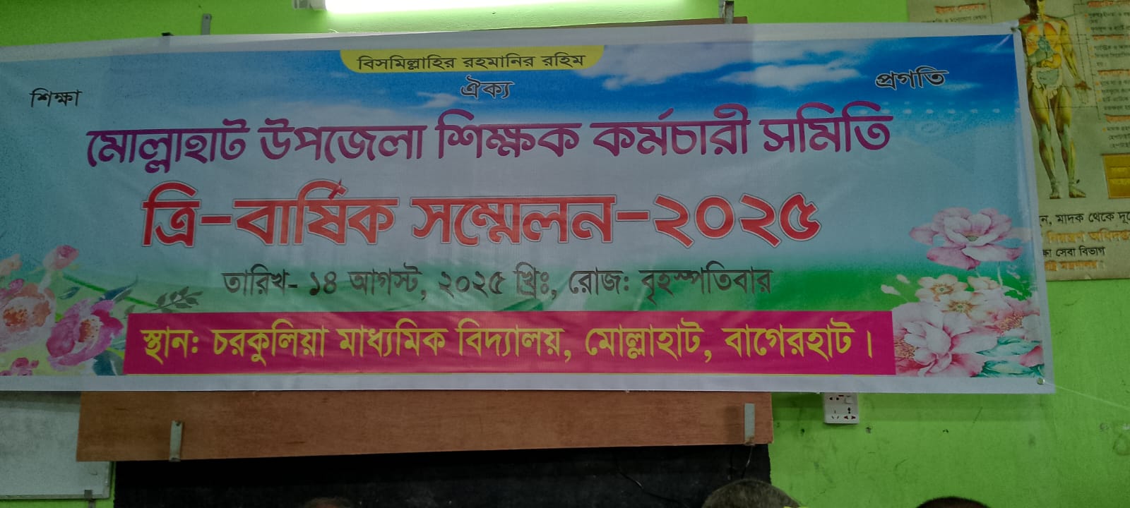 মোল্লাহাট(বাগেরহাট)প্রতিনিধি: বাগেরহাটের মোল্লাহাটে উৎসবমুখর পরিবেশে উপজেলা শিক্ষক কর্মচারী সমিতির ত্রিবার্ষিক সম্মেলন অনুষ্ঠিত হয়েছে। বৃহস্পতিবার (১৪ আগস্ট) সকাল ১১টায় চরকুলিয়া মাধ্যমিক বিদ্যালয়ে এ সম্মেলনের আয়োজন করা হয়।