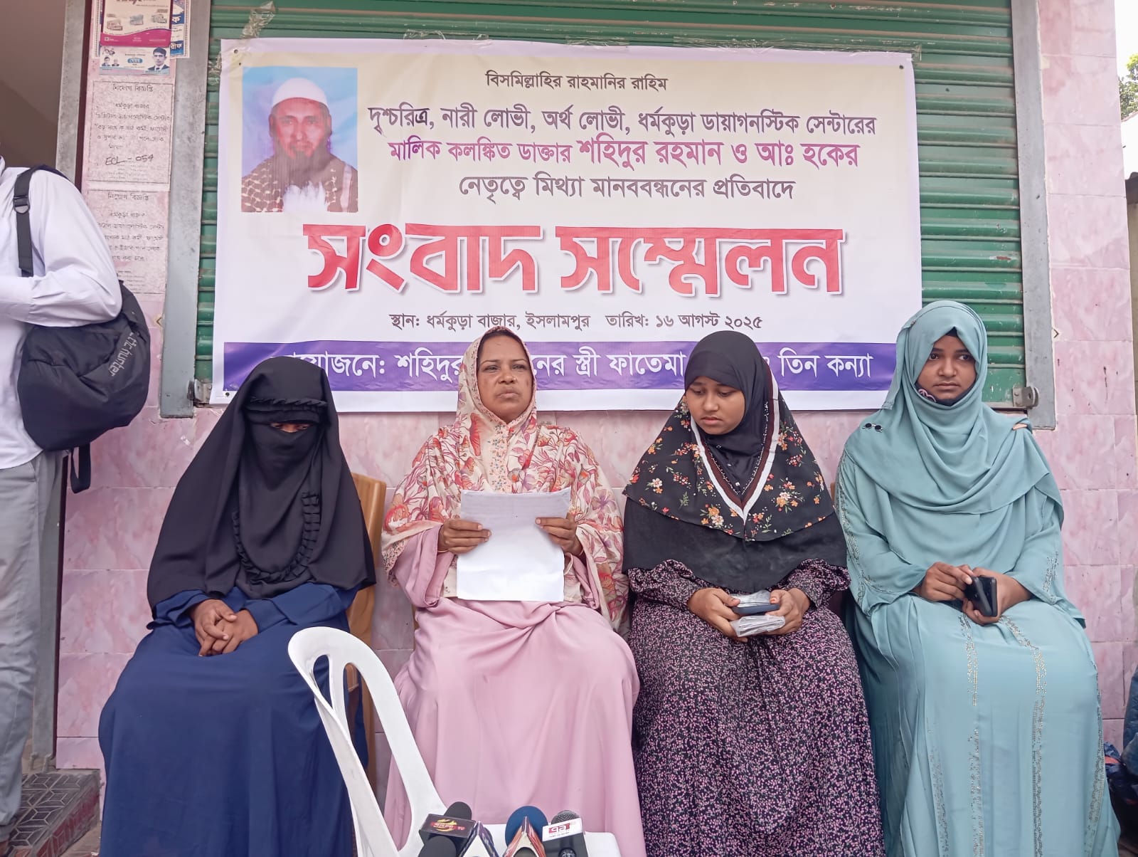 শনিবার (১৬আগস্ট) দুপুরে পৌর শহরের ধর্মকুড়া বাজার মোড়ে ধর্মকুড়া ডায়াগনস্টিক সেন্টারের সন্মূখে তিন কন্যা সন্তান নিয়ে সংবাদ সম্মেলনের আয়োজন করেন ভুক্তভোগী স্ত্রী ফাতেমা খানম।