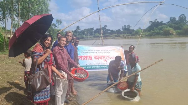 নালিতাবাড়ীতে মাছের উৎপাদন বৃদ্ধিতে পোনা মাছ অবমুক্তকরণ কর্মসূচি