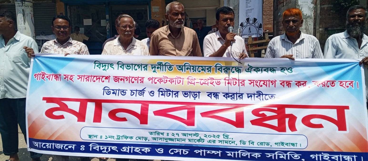 গাইবান্ধা থেকে মোঃ আবু জাফর মন্ডলঃ গাইবান্ধায় বিদ্যুৎ বিভাগের নানা অনিয়ম ও দুর্নীতি বন্ধের দাবিতে এবং অবৈধ প্রিপেইড মিটার সংযোগ বাতিলের দাবিতে গাইবান্ধায় মানববন্ধন অনুষ্ঠিত হয়েছে।