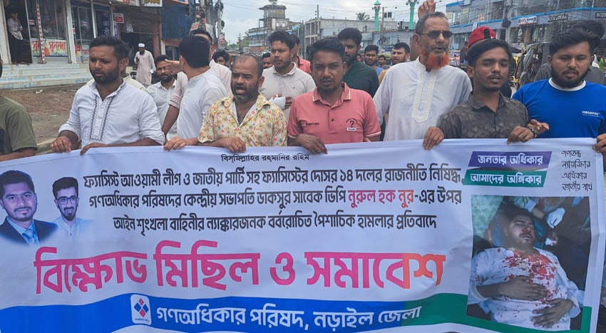 নড়াইল প্রতিনিধি: ফ্যাসিস্ট আওয়ামী লীগ ও জাতীয় পার্টিসহ ফ্যাসিস্টদের দোসর ১৪ দলের রাজনীতি নিষিদ্ধ, গণঅধিকার পরিষদের কেন্দ্রীয় সভাপতি ডাকসুর সাবেক ভিপি নূরুল হক নূর’র ওপর আইন শৃংখলা বাহিনীর ন্যাক্কারজনক বর্বরোচিত পৈশাচিক হামলার প্রতিবাদে নড়াইলে বিক্ষোভ মিছিল ও সমাবেশ করেছে গণঅধিকার পরিষদ।