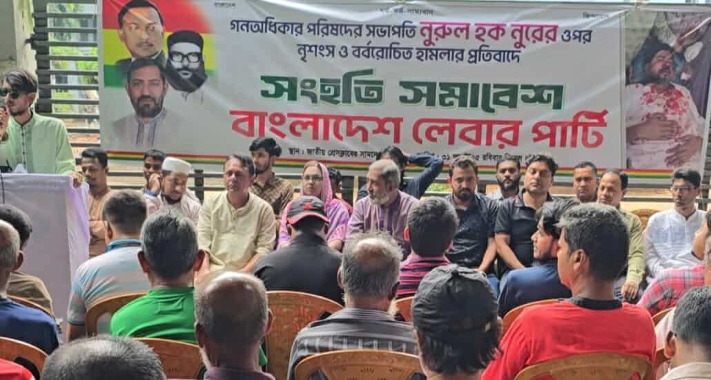 গণঅধিকার পরিষদের সভাপতি নুরুল হক নুরসহ নেতাকর্মীদের ওপর হামলার প্রতিবাদে বাংলাদেশ লেবার পার্টির উদ্যোগে জাতীয় প্রেসক্লাবের সামনে সংহতি সমাবেশ অনুষ্ঠিত হয়েছে।