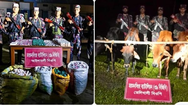 শেরপুর ও হালুয়াঘাট সীমান্তে বিপুল পরিমাণে ভারতীয় ঔষধ,মদ ও গরু আটক