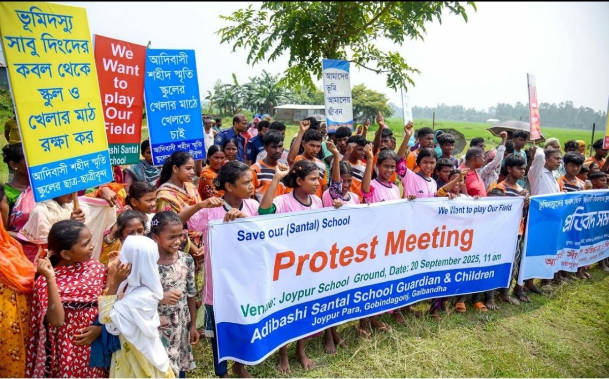 গোবিন্দগঞ্জে স্কুল ও খেলার মাঠ দখলের প্রতিবাদে সাঁওতালদের সমাবেশ