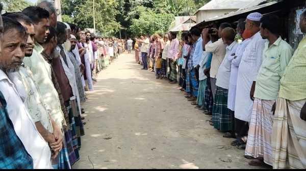 রবিবার (২১ সেপ্টেম্বর) সকালে উপজেলার কাংশা ইউনিয়নের গান্ধিগাঁও টাঙ্গাইলা পাড়া রাজ্জাক মোড়ে নারী-শিশুসহ প্রায় সহস্রাধিক মানুষ অংশগ্রহণে এ কর্মসূচি পালিত হয়। মানববন্ধনে বক্তব্য রাখেন, নিহতের বাবা কালু গাজি,ফুফু ইসমত আরা,অবসরপ্রাপ্ত বিজিবি সদস্য গৌরাঙ্গ, মাহফুজুর রহমান,দুলাল মন্ডল,এফএম সুলতান আহম্মেদ,আরেফিন সোহাগসহ অনেকে।