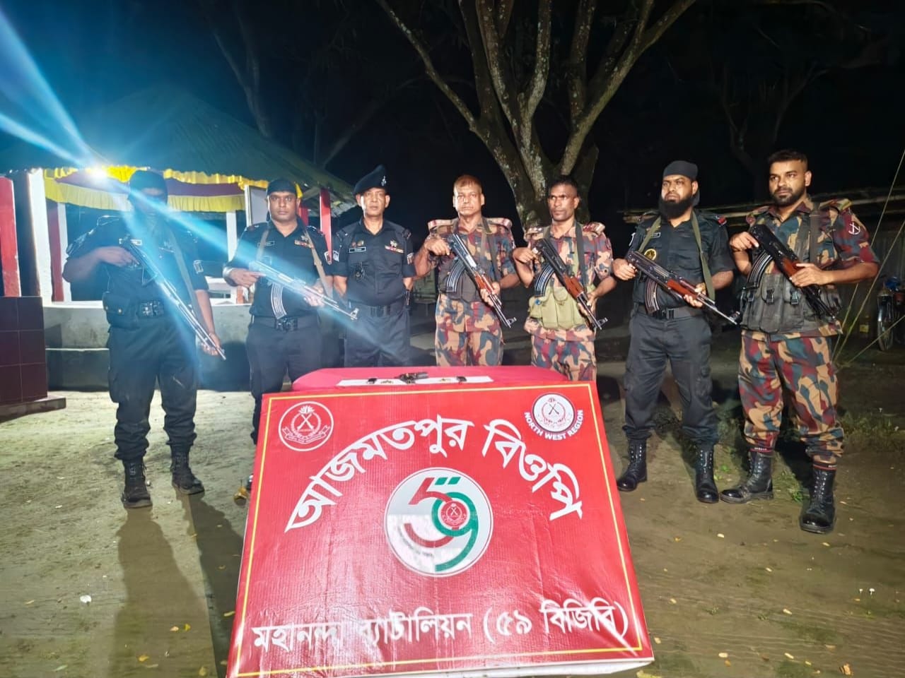 ০৬ রাউন্ড গুলি এবং ০২টি ম্যাগাজিন আটক করতে সক্ষম হয়। আটককৃত অস্ত্র, গুলি এবং ম্যাগাজিন জিডি এবং শিবগঞ্জ থানায় হস্তান্তর করা হয়েছে। উল্লেখ্য, বর্ণিত অভিযানে RAB এর পক্ষে নেতৃত্ব দেন সিপিসি-১, চাঁপাইনবাবগঞ্জ এর কোম্পানী কমান্ডার লেঃ সাঈদ মাহমুদ সাদান (বিএন) এবং বিজিবি এর পক্ষে নেতৃত্ব দেন আজমতপুর বিওপি কমান্ডার নায়েব সুবেদার মোঃ শাহীনুর রহমান।