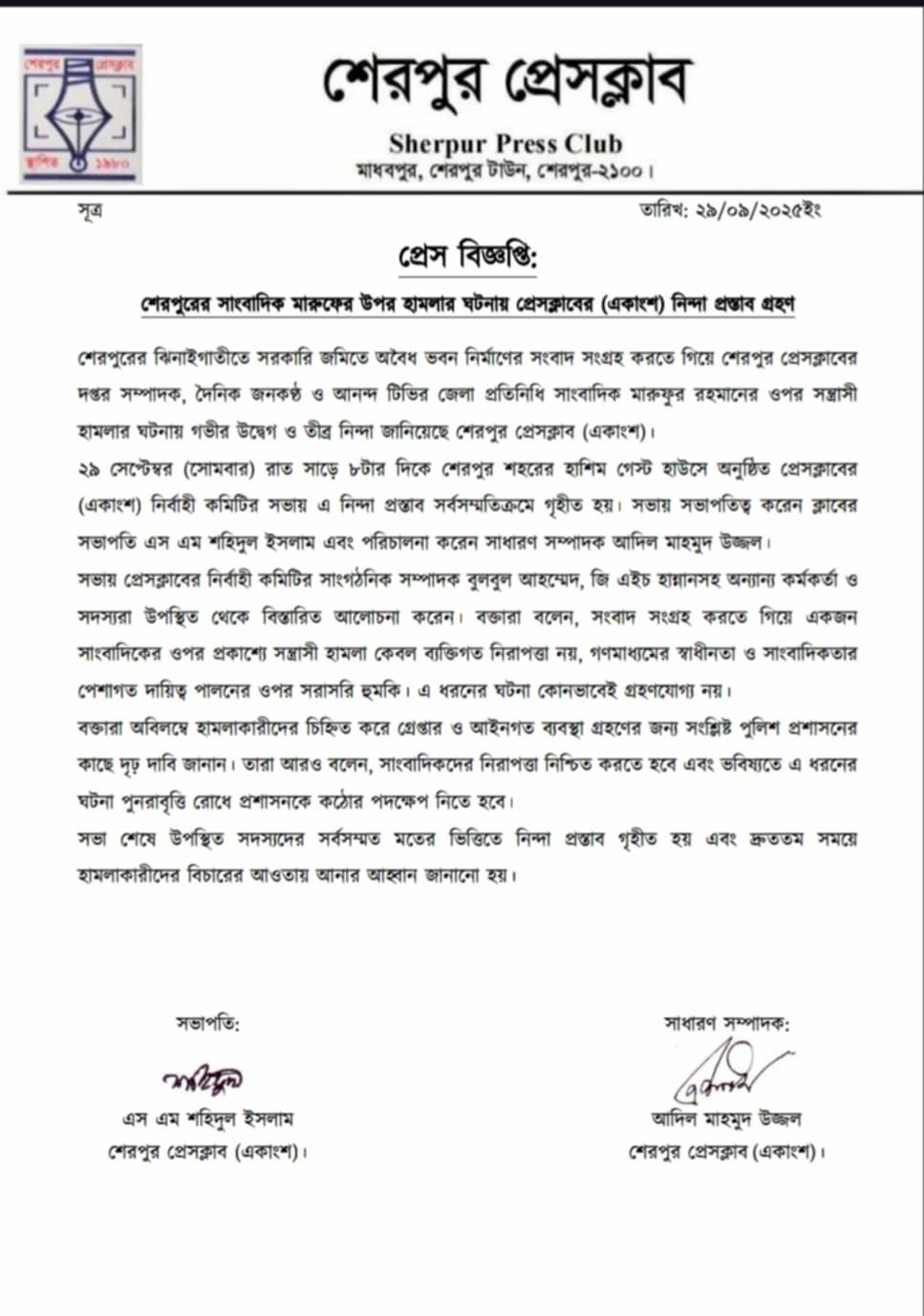 সোমবার (২৯ সেপ্টেম্বর) রাত সাড়ে ৮ টায় শেরপুর শহরের হাশিম গেস্ট হাউসে অনুষ্ঠিত নির্বাহী কমিটির সভায় এ নিন্দা প্রস্তাব সর্বসম্মতিক্রমে গৃহীত হয়। সভায় সভাপতিত্ব করেন প্রেসক্লাবের সভাপতি এস এম শহিদুল ইসলাম এবং সঞ্চালনা করেন সাধারণ সম্পাদক আদিল মাহমুদ উজ্জল।