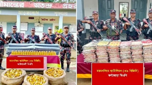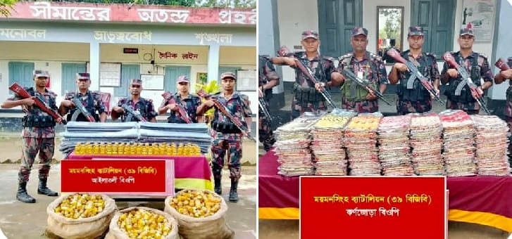 সোমবার (১৩ অক্টোবর) গোপন সংবাদের ভিত্তিতে ময়মনসিংহ জেলার হালুয়াঘাট উপজেলার মিনারঘাট এবং শেরপুর জেলার শ্রীবরদী উপজেলার চুকচুকি পাড়া সীমান্ত এলাকা দিয়ে চোরাকারবারীরা অভিনব কৌশলে এসব মালামাল পাচারের চেষ্টা করছিল বলে জানা গেছে।