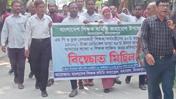 কাহারোল (দিনাজপুর) প্রতিনিধি।। দিনাজপুরের কাহারোল উপজেলায় এম পি ও ভূক্ত বেসরকারি শিক্ষক ও কর্মচারীদের বিক্ষোভ মিছিল অনুষ্ঠিত। বাংলাদেশ শিক্ষক সমিতি কাহারোল উপজেলা শাখার আয়োজনে এম পি ও ভূক্ত বেসরকারি শিক্ষক ও কর্মচারীদের ২০% বাড়ী ভাড়া,১৫০০ টাকা মেডিক্যাল ভাতা, ৭৫% উৎসব ভাতা আদায়ের লক্ষে ও ঢাকায় আন্দেলন রত শিক্ষকদের লাঞ্চিত করার প্রতিবাদে ১৬ অক্টোবর ২০২৫ ইং বৃহস্পতিবার সকাল ১১ টায় উপজেলা স্মৃতি সৌধ প্রাঙ্গন হতে একটি বিক্ষোভ মিছিল বের হয়। মিছিল টি উপজেলা সদরের প্রধান প্রধান সড়ক প্রদক্ষিন করে কাহারোল উপজেলা কেন্দ্রীয় স্মৃতি সৌধে এসে শেষ হয়। মিছিল শেষে বাংলাদেশ শিক্ষক সমিতি কাহারোল উপজেলা শাখার সভাপতি প্রধান শিক্ষক মোঃ মাহবুবুর রহমানের সভাপতিত্বে এক আলোচনা সভা অনুষ্ঠিত হয়েছে। আলোচনা সভায় বক্তব্য রাখেন, বাংলাদেশ স্কাউট রংপুর অঞ্চলের সাধারণ সম্পাদক প্রধান শিক্ষক মোঃ আবু সাইদ,