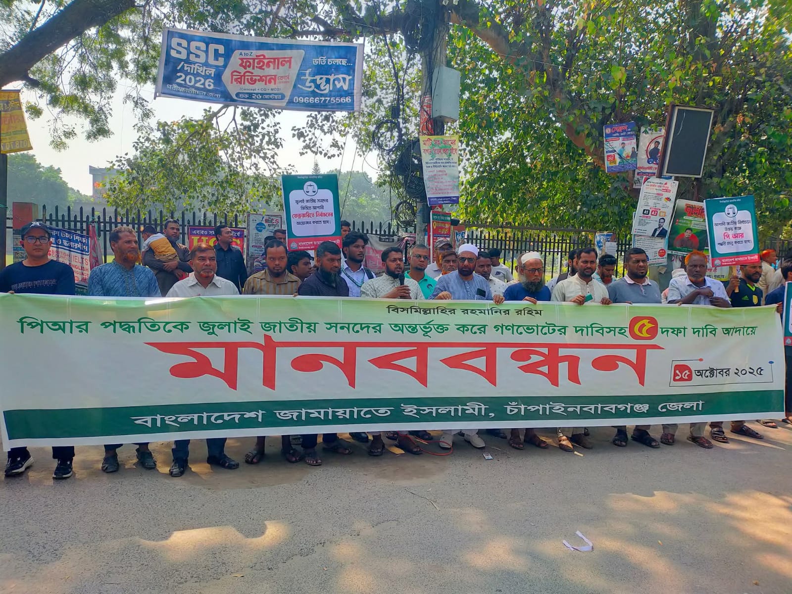 পিআর পদ্ধতিকে জুলাই জাতীয় সনদের অন্তর্ভুক্ত করে গণভোটের দাবিসহ ৫ দফা দাবি বাস্তবায়নের লক্ষ্যে চাঁপাইনবাবগঞ্জে মানববন্ধন অনুষ্ঠিত হয়েছে।