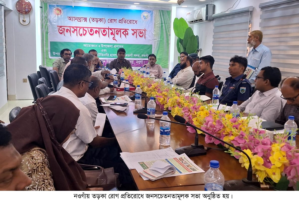 নওগাঁয় অ্যানথ্রাক্স(তড়কা) রোগ প্রতিরোধে এক জনসচেনতামূলক সভা অনুষ্ঠিত হয়েছে। বৃহস্পতিবার সদর উপজেলা পরিষদ সভা কক্ষে সদর উপজেলা প্রশাসন ও উপজেলা প্রাণিসম্পদ দপ্তরের আয়োজনে এই সভা অনুষ্ঠিত হয়।