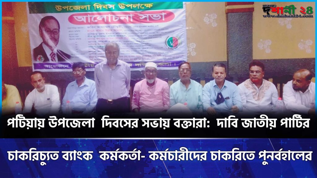 সভায় বক্তারা বলেন, পটিয়া সহ চট্টগ্রামে চলতি বছর বিভিন্ন সময়ে প্রায় ১০ হাজার ব্যাংক কর্মকর্তা কর্মচারীদের চাকরিচ্যুত হয়েছে। অনতিবিলম্ব চাকরিচ্যুত ব্যাংক কর্মকর্তা- কর্মীচারীদের চাকরিতে পুনর্বহালের দাবি জানান,অন্যতাই জাতীয় পার্টি বৃহৎ আন্দোলন গড়ে তুলতে বাধ্য হবে বলে হুশিয়ারী উচ্চারণ করেন।