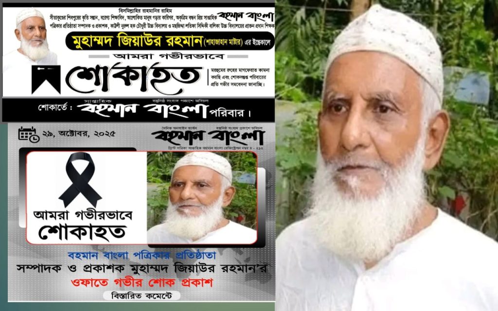 বিশেষ সংবাদদাতাঃ চট্টগ্রামের সীতাকুণ্ডের কৃতি সূর্য সন্তান আলোকিত মানুষ গড়ার কারিগর, অকৃত্রিম বন্ধন প্রিয় সাপ্তাহিক “বহমান বাংলা” পত্রিকার প্রতিষ্ঠাতা সম্পাদক ও প্রকাশক, বরেণ্য শিক্ষাবিদ কাট্টলী নুরুল হক চৌধুরী উচ্চ বিদ্যালয় ও মছজিদ্দা লতিফা সিদ্দিকী বালিকা উচ্চ বিদ্যালয়ের প্রাক্তন প্রধান শিক্ষক মুহাম্মদ জিয়াউর রহমান (শাহজাহান মাস্টার) (৯৭) ইন্তেকাল করেছেন। (ইন্না লিল্লাহি ওয়া ইন্না ইলাইহি রাজিউন)