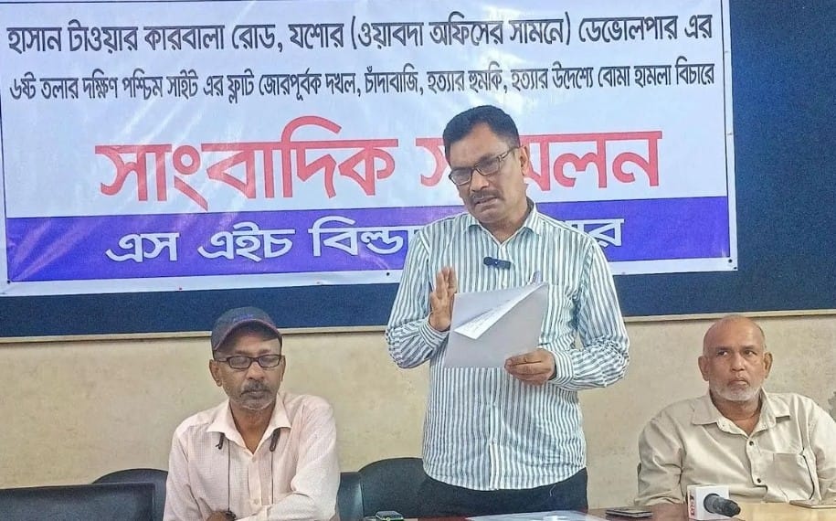 যশোর শহরের ওয়াপদা কারবালায় ফ্ল্যাট দখল, চাঁদাবাজি, বোমা হামলা ও হত্যার হুমকির অভিযোগ তুলে ব্যক্তিগত নিরাপত্তা দাবিতে সংবাদ সম্মেলন করেছেন স্থানীয় ডেভোলপার প্রতিষ্ঠান এস এইচ বিল্ডার্সের পরিচালক এস এম রফিকুল ইসলাম হীরক। রোববার দুপুরে প্রেসক্লাব যশোরে এই সংবাদ সম্মেলনে লিখিত বক্তব্য পাঠ করেন তিনি। এই সময় জমির মালিক রশিদুল হাসান মনা, শুভাকাঙ্ক্ষী টিপু সুলতান উপস্থিত ছিলেন।