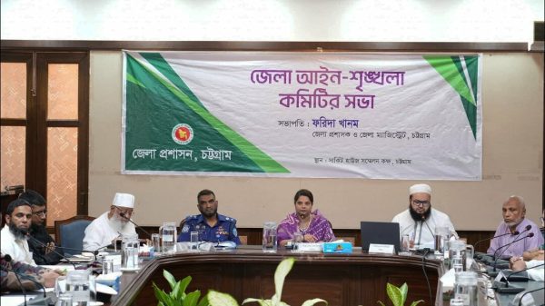 নিজস্ব প্রতিবেদক, চট্টগ্রাম চট্টগ্রাম সার্কিট হাউস সম্মেলন কক্ষে আজ অনুষ্ঠিত হলো জেলা আইন-শৃঙ্খলা কমিটির মাসিক সভা। সভায় সভাপতিত্ব করেন চট্টগ্রামের জেলা প্রশাসক ও জেলা ম্যাজিস্ট্রেট ফরিদা খানম। সভায় জেলার সামগ্রিক