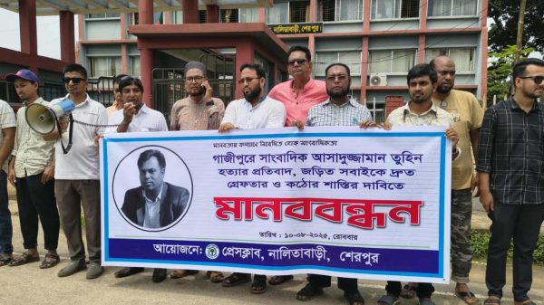 তানিম আহমেদ নালিতাবাড়ী শেরপুর) প্রতিনিধি: গাজীপুরে দৈনিক প্রতিদিনের কাগজ পত্রিকার সাংবাদিক আসাদুজ্জামান তুহিন হত্যার প্রতিবাদে শেরপুরের নালিতাবাড়ীতে মানববন্ধন অনুষ্ঠিত হয়েছে। রোববার (১০ আগস্ট) সকালে উপজেলা পরিষদের সামনে প্রেসক্লাব নালিতাবাড়ীর উদ্যোগে