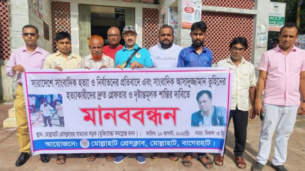 মোল্লাহাট প্রতিনিধি: গাজীপুরে চাঞ্চল্যকর সাংবাদিক আসাদুজ্জামান তুহিন হত্যাকান্ডের প্রতিবাদে মোল্লাহাট প্রেসক্লাবের পক্ষ থেকে মানববন্ধন কর্মসূচি পালিত হয়েছে। রবিবার (১০ আগস্ট) ৩টায় মোল্লাহাট প্রেসক্লাবের সামনের সড়কে অনুষ্ঠিত উক্ত মানববন্ধনে সারাদেশে সাংবাদিকদের
