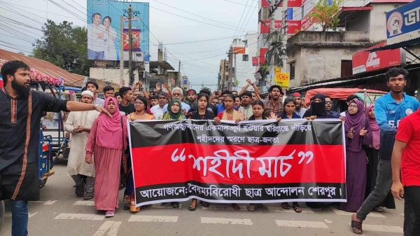 মোহাম্মদ দুদু মল্লিক শেরপুর। সরকার পতনের এক দফা দাবিতে বৈষম্যবিরোধী ছাত্র আন্দোলনে শহীদদের স্মরণে এবং গণঅভ্যুত্থানের এক মাসপূর্তিতে কেন্দ্রীয় কর্মসূচির অংশ হিসেবে শহীদী মার্চ ও দোয়া অনুষ্ঠিত হয়েছে। ৫ সেপ্টেম্বর