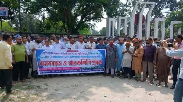 মুহাম্মাদ লিটন ইসলাম নিজস্ব প্রতিবেদকঃ চিরিরবন্দরে এমপিও ভুক্ত শিক্ষকদের বেতন-ভাতার বৈষম্য নিরসনের দাবিতে মানববন্ধন ও স্মারকলিপি প্রদান অনুষ্ঠিত হয়েছে। আজ রবিবার (১৯ অক্টোবর) সকাল ১১ঘটিকায় উপজেলার কেন্দ্রীয় শহীদ মিনারে শিক্ষক