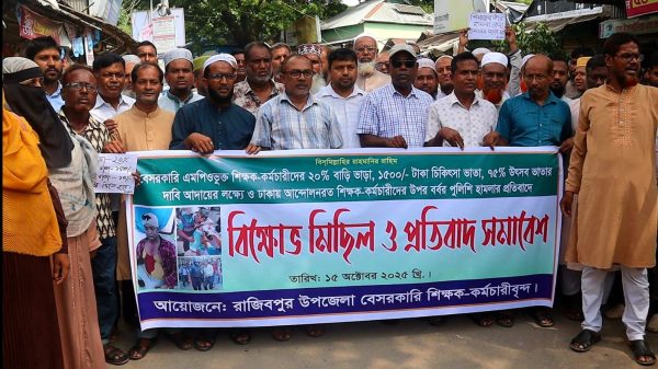 নিজস্ব প্রতিনিধি তারিকুল ইসলাম তারাঃ বেসরকারি এমপিওভুক্ত শিক্ষক ও কর্মচারীদের ন্যায্য দাবি—২০ শতাংশ বাড়ি ভাতা, ১,৫০০ টাকা চিকিৎসা ভাতা এবং ৭৫ শতাংশ উৎসব ভাতা বাস্তবায়নের দাবিতে চলমান আন্দোলনের অংশ হিসেবে