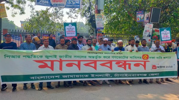 মাহিদুল ইসলাম ফরহাদ চাঁপাইনবাবগঞ্জ জেলা প্রতিনিধি পিআর পদ্ধতিকে জুলাই জাতীয় সনদের অন্তর্ভুক্ত করে গণভোটের দাবিসহ ৫ দফা দাবি বাস্তবায়নের লক্ষ্যে চাঁপাইনবাবগঞ্জে মানববন্ধন অনুষ্ঠিত হয়েছে। বুধবার সকালে জেলা প্রশাসকের কার্যালয়ের সামনে
