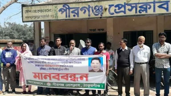 মোঃ আইনুল হক পীরগঞ্জ(ঠাকুরগাঁও)প্রতিনিধিঃ প্রকল্পের তথ্য চাওয়ায় শেরপুরের নকলায় দৈনিক দেশ রূপান্তরের উপজেলা সংবাদদাতা শফিউজ্জামান রানার বিরুদ্ধে মিথ্যা অভিযোগে ভ্রাম্যমান আদালত বসিয়ে ছয় মাসের কারাদণ্ড দেয়ার প্রতিবাদে ঠাকুরগাঁওয়ের পীরগঞ্জে মানববন্ধন