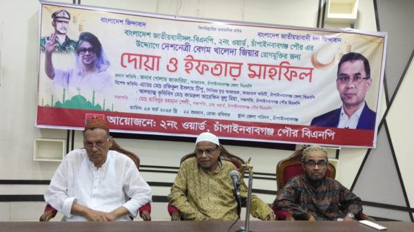 মাহিদুল ইসলাম ফরহাদ চাঁপাইনবাবগঞ্জ প্রতিনিধিঃ বাংলাদেশ জাতীয়তাবাদী দল বিএনপির চেয়ারপার্সন বেগম খালেদা জিয়ার রোগ মুক্তি কামনায় বিএনপি চাঁপাইনবাবগঞ্জের পৌর ২ নং ওয়ার্ড আয়োজনে ইফতার মাহফিল অনুষ্ঠিত হয়। রবিবার (২৩ মার্চ) বিকেলে