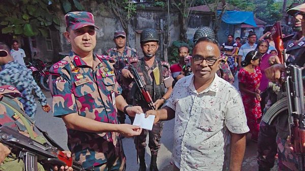 মাহিদুল ইসলাম ফরহাদ চাঁপাইনবাবগঞ্জ জেলা প্রতিনিধি চাঁপাইনবাবগঞ্জের সীমান্তবর্তী এলাকার দুর্গাপূজার মন্ডপের নিরাপত্তায় ৬ প্লাটুন বিজিবি সদস্য মোতায়েন করা হয়েছে। পূজা বিসর্জন পর্যন্ত মন্ডপ ও আশেপাশের এলাকায় সার্বক্ষণিক নিরাপত্তা দেবে বিজিবি