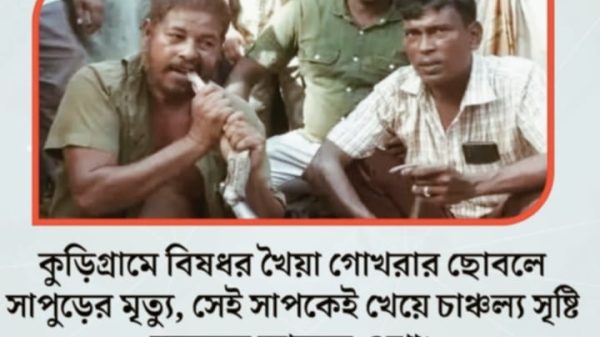 নিজস্ব প্রতিবেদকঃ কুড়িগ্রামে বিষাক্ত খৈয়া গোখরার ছোবলে সাপুড়ের মৃত্যু, কাঁচা সাপ খেয়ে চাঞ্চল্য সৃষ্টি করলেন আরেক ওঝা। কুড়িগ্রামের নাগেশ্বরী উপজেলায় খৈয়া গোখরা ছোবলে এক অভিজ্ঞ সাপুড়ে মারা গেছেন। আর এই