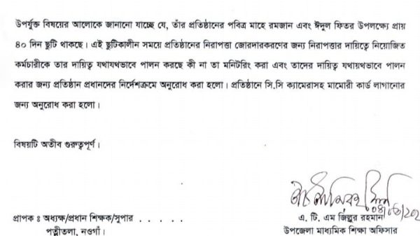 মর্তুজা শাহাদত সাধন, নওগাঁ প্রতিনিধিঃ নওগাঁর পত্নীতলায় অবস্থিত বেসরকারি শিক্ষা প্রতিষ্ঠান গুলোতে দীর্ঘ এই ছুটিকালীন সময়ে প্রতিষ্ঠানের সামগ্রিক জিনিষপত্রাদি চুরি রোধে রাত্রিবেলায় নিরাপত্তা জোরদার করার নির্দেশ দিয়েছেন উপজেলা মাধ্যমিক শিক্ষা