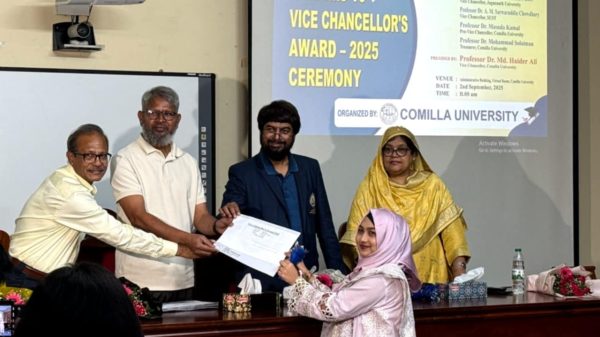 মোহাম্মদ দুদু মল্লিক,শেরপুর : কুমিল্লা বিশ্ববিদ্যালয়ের ২০২৫ সনের ভাইস চ্যাঞ্চেলর এওয়ার্ড পেলেন শেরপুরের ঝিনাইগাতী উপজেলা সদরের বাসিন্দা মেধাবী লুবনা জামান লিয়া। আজ বিশ্ববিদ্যালয় অডিটোরিয়ামে অনুষ্ঠিত এক সম্বর্ধনা অনুষ্ঠানের মাধ্যমে এ