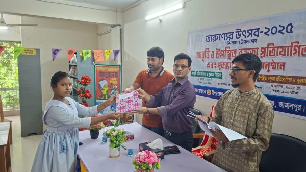 রাশেদুল ইসলাম রনিঃ জামালপুরের বকশীগঞ্জে তারন্যের উৎসব উদযাপন উপলক্ষে আবৃত্তি ও উপস্থিত বক্তৃতা প্রতিযোগি বিজয়ীদের মাঝে পুরষ্কার বিতরণ করা হয়েছে। মঙ্গলবার (১৫ জুলাই) উপজেলা সরকারি গণগ্রন্থাগারের আয়োজনে দুপুরে উপজেলা সরকারি